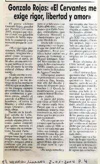 Gonzalo Rojas : "El Cervantes me exige rigor, libertad y amor" [artículo]. El Heraldo (Diario : Linares, Chile)-- ene. 2, 2004, p. 4. .
