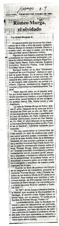 Romeo Murga, el olvidado [artículo] / Oriel Alvarez G. Atacama (Diario : Copiapó, Chile)-- ene. 9, 2004, p. 4. .