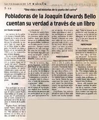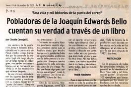 Pobladoras de la Joaquín Edwards Bello cuentan su verdad a través de un libro [artículo] / Claudia Carvajal. La Estrella (Diario : Valparaíso, Chile)-- dic. 24, 2001, p. 23. .