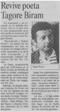 Revive poeta Tagore Biram. [artículo] Crónica (Diario : Concepción, Chile)-- jun. 30, 2003, p. 15. retr. .