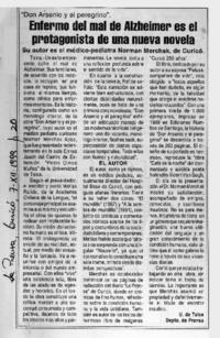 Enfermo del mal de Alzheimer es el protagonista de una nueva novela. [artículo] La Prensa (Diario : Curicó, Chile)-- dic. 7, 1999, p. 20. .