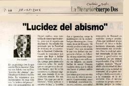 Lucidez del abismo" [artículo] / Tito Castillo. La Discusión (Chillán, Chile)-- ene. 18, 2004, p. B6 (suplemento "Cuerpo Dos"). retr. .