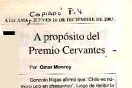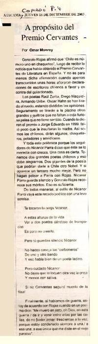 A propósito del Premio Cervantes [artículo] / Omar Monroy. Atacama (Copiapó, Chile)-- dic. 18, 2003, p. 4. .
