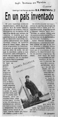 En un país inventado [artículo] / A. Lavquén. La Prensa (Curicó, Chile)-- feb. 1, 2004, p. 3 (suplemento "Domingo en Familia"). .