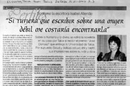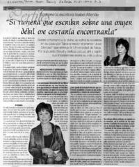 "Si tuviera que escribir sobre una mujer débil me costaría encontrarla" [artículo]. El Centro (Talca, Chile)-- dic. 16, 2003, p. 3 (suplemento "Salud Belleza"). .