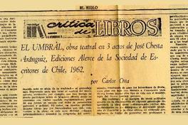 El umbral, obra teatral en 3 actos de José Chesta Aránguiz [artículo] / Carlos Ossa. El Siglo (diario : Santiago, Chile)-- ago. 5, 1962, p. 2. .