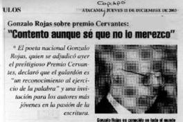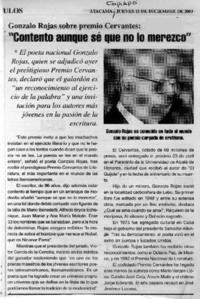 Gonzalo Rojas sobre premio Cervantes: "Contento aunque sé que no lo merezco". [artículo] Atcacama (Copiapó, Chile)-- dic. 11, 2003. retr. .