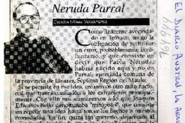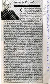 Neruda Parral [artículo] / Ulises Valderrama. El Diario Austral (Araucanía, Chile)-- abr. 24, 2004, p. A3. retr. .