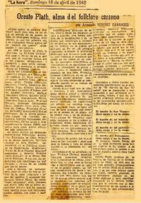 Oreste Plath, alma del folklore chileno [artículo] / Armando Méndez Carrasco. La Hora (Santiago, Chile : 1935)-- abr. 18, 1948. .
