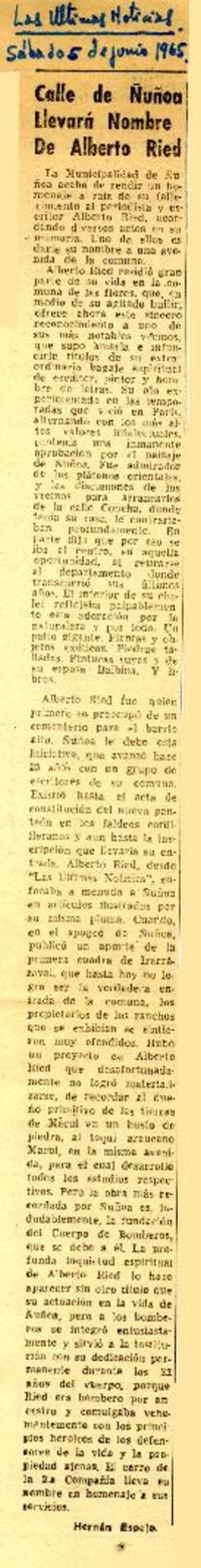Calle de Ñuñoa llevará nombre de Alberto Ried [artículo] Hernán Espejo.
