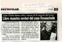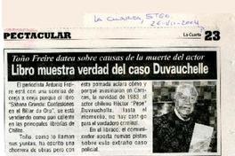 Libro muestra verdad del caso Duvauchelle Toño Freire datea sobre causas de la muerte del actor. [artículo] / La Cuarta (Diario : Santiago, Chile)-- jul. 26, 2004, p. 23. .