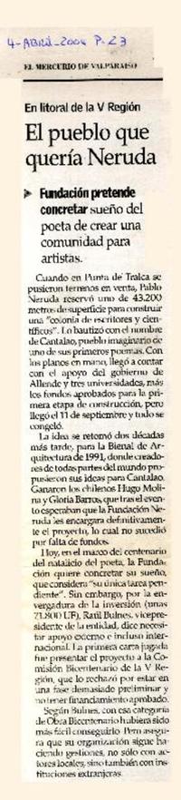 El pueblo que quería Neruda. [artículo] El Mercurio (Valparaíso, Chile)-- abr. 4, 2004, p. 23. .