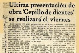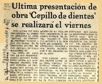 Ultima presentación de obra "Cepillo de dientes" se realizará el viernes [artículo] La Defensa (Arica, Chile)-- jul. 16, 1980, p. 5. .