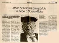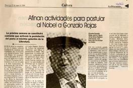 Afinan actividades para postular al Nobel a Gonzalo Rojas [artículo] La Discusión (Chillán, Chile)-- mayo 23, 2004, p. 5. retr. .