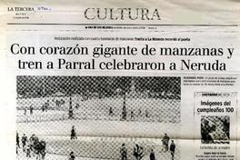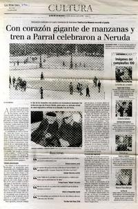 Con Corazón gigante de manzanas y tren a Parral celebraron a Neruda Instalación realizada con cuatro toneladas de manzanas frente a La Moneda recordó al poeta [artículo] : La Tercera (Diario : Santiago, Chile)-- jul. 13, 2004, p. 33. .