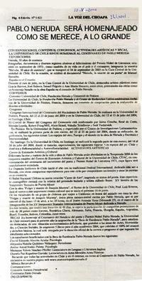 Pablo Neruda será homenajeado como se merece, a lo grande [artículo] La Voz del Choapa (Illapel, Chile)-- no. 5622 (mayo 13, 2004) p. 6. .