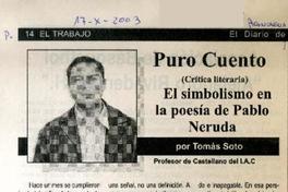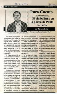 El simbolismo en la poesía de Pablo Neruda [artículo] / Tomás Soto. El Trabajo (San Felipe, Chile)-- oct. 17, 2003, p. 14. retr. .