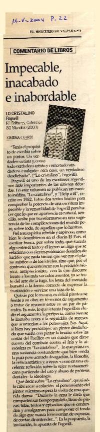Impecable, inacabado e inabordable [artículo] / Ximena Ceardi. El Mercurio (Valparaíso, Chile)-- mayo 16, 2004, p. 22. il. .