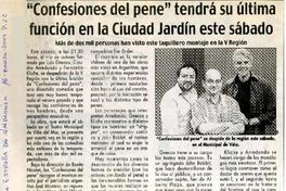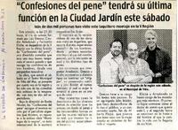 Confesiones del pene" tendrá su última función en la Ciudad Jardín este sábado. [artículo] La Estrella (Valparaíso, Chile)-- mar. 16, 2004, p. 22. retr. .