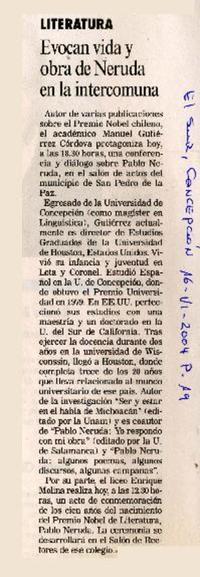Evocan vida y obra de Neruda en la intercomuna. [artículo] El Sur (Diario : Concepción, Chile)-- jun. 16, 2004, p. 19. .