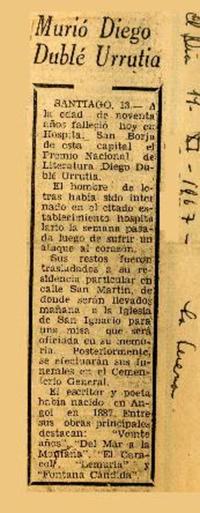Murió Diego Dublé Urrutia. [artículo] El Día (Diario : La Serena, Chile)-- nov. 14, 1967. .