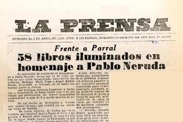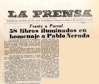 58 libros iluminados en homenaje a Pablo Neruda. [artículo] La Prensa (Parral, Chile)-- mayo 30, 2004, p. 1. .