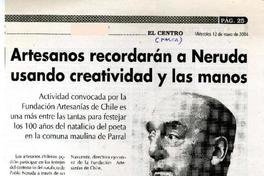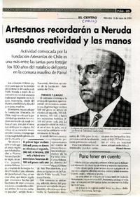 Artesanos recordarán a Neruda usando creatividad y las manos. [artículo] El Centro (Talca, Chile)-- mayo 12, 2004, p. 25. retr. .