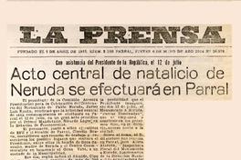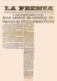 Acto central de natalicio de Neruda se efectuará en Parral. [artículo] La Prensa (Parral, Chile)-- mayo 6, 2004. .