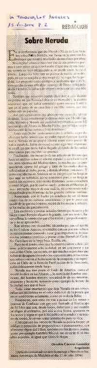 Sobre Neruda [artículo] / Osvaldo Cáceres. La Tribuna (Los Angeles, Chile)-- jul. 15, 2004, p. 2. .
