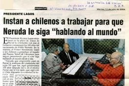 Instan a chilenos a trabajar para que Neruda le siga "Hablando al mundo" [artículo] La Estrella (Chiloé, Chile)-- jul. 13, 2004, p. B8. El Llanquihue (Diario : Puerto Montt, Chile)-- retr. .