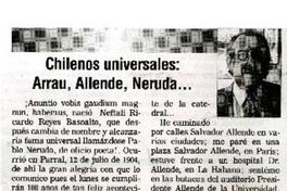 Chilenos universales : Arrau, Allende, Neruda... [artículo] / Hugo Olea Morales. Crónica (Concpeción, Chile)-- jul. 10, 2004, p. 6. retr. .