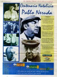 Pablo Neruda : Premio Nobel de Literatura A 100 años de su natalicio [artículo] : El Centro (Talca, Chile)-- jul. 12, 2004, p. 1-3 (suplemento) retr. .