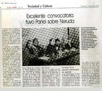 Excelente convocatoria tuvo panel sobre Neruda. [artículo] La Discusión (Chillán, Chile)-- jul. 14, 2004, p. 4. .