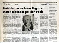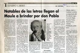 Notables de las letras llegan al Maule a brindar por don Pablo. [artículo] El Centro (Talca, Chile)-- jul. 7, 2004, p. 27. .