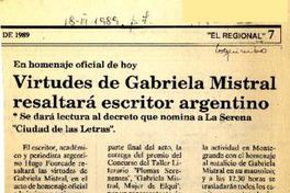 Virtudes de Gabriela Mistral resaltará escritor argentino [artículo] El Regional (Coquimbo, Chile)-- mar. 18, 1989, p. 7. .