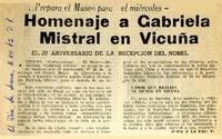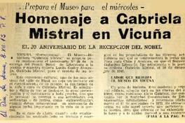 Homenaje a Gabriela Mistral en Vicuña ...Prepara el Museo para el Miércoles [artículo] :