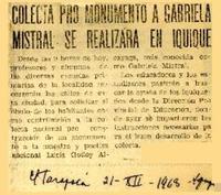 Colecta pro monumento a Gabriela Mistral se realizará en Iquique. [artículo] El Tarapacá (Iquique, Chile)-- dic. 21, 1968. .