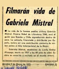 Filmarán vida de Gabriela Mistral [artículo] La Segunda (Santiago, Chile)-- mar. 5, 1975, p. 21. .