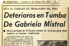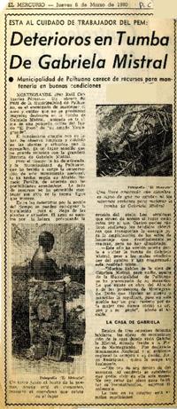 Deterioros en tumba de Gabriela Mistral. [artículo] El Mercurio-- mar. 6, 1980, p. C7. .