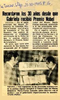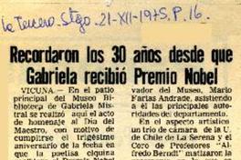 Recordaron los 30 años desde que Gabriela recibió Premio Nobel [artículo] El Mercurio (Santiago, Chile)-- dic. 21, 1975, p. 16. .