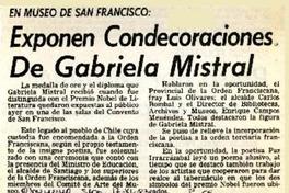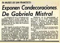 Exponen condecoraciones Gabriela Mistral [artículo] El Mercurio (Santiago, Chile)-- nov. 17, 1983, p. C5. .