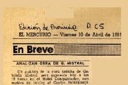 Analizan obra de G. Mistral [artículo] El Mercurio (Santiago, Chile)-- abr. 10, 1981, p. C5 (Edición de Provicncia) .