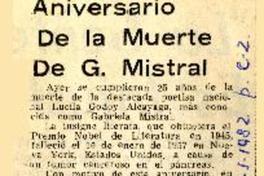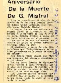 Aniversario de la muerte de G. Mistral [artículo] El Mercurio (Santiago, Chile)-- ene. 2, 1982, p. C2. .