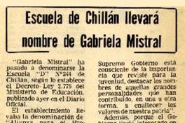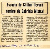 Escuela de Chillán llevará nombre de Gabriela Mistral [artículo] La Tercera de la Hora (Santiago, Chile)-- nov. 25, 1979, p. 31. .