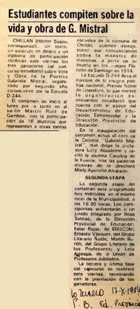 Estudiantes compiten sobre la vida y obra de G. Mistral [artículo] La Tercera de la Hora (Diario : Santiago, Chile)-- oct. 17, 1984, p. 8 (Ed. de Provincia) .