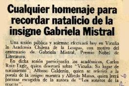 Cualquier homenaje para recordar natalicio de la insigne Gabriela Mistral [artículo]. La Cuarta (Diario : Santiago, Chile)-- mar. 7, 1989, p. 6. .