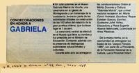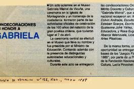 Condecoraciones en honor a Gabriela [artículo] Revista de Educación (Santiago, Chile)-- no. 166 (mayo 1989) p. 10. .