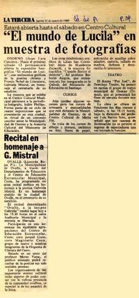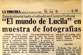 "El mundo de Lucila" en muestra de fotografías [artículo] la Tercera de la Hora (Diario : Santiago, Chile)-- mayo 11, 1989, p. 39 (Ed. de Provincia) .