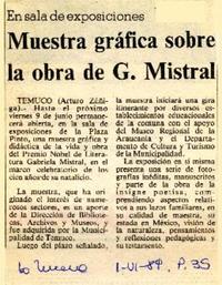 Muestra gráfica sobre la obra de G. Mistral [artículo] La Tercera de la Hora (Diario : Santiago, Chile)-- abr. 1, 1989, p. 35. .