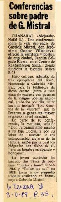 Conferencias sobre padre de G. Mistral [artículo] / Alejandro Nofal S. La Tercera de la Hora (Diario : Santiago, Chile)-- mayo 3, 1989, p. 35. .